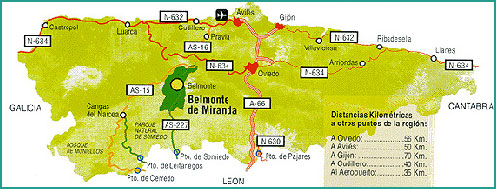 El concejo de Belmonte de Miranda se localiza a caballo entre la subregión Central y Occidental de Asturias, en su mitad meridional. Su capital dista de Oviedo 56 kilómetros (una hora de viaje a través de la C-634); 57 kilómetros de Avilés con la que enlaza por la cómoda vía del "Corredor del Narcea" y 84 kilómetros de Gijón (una hora de trayecto).